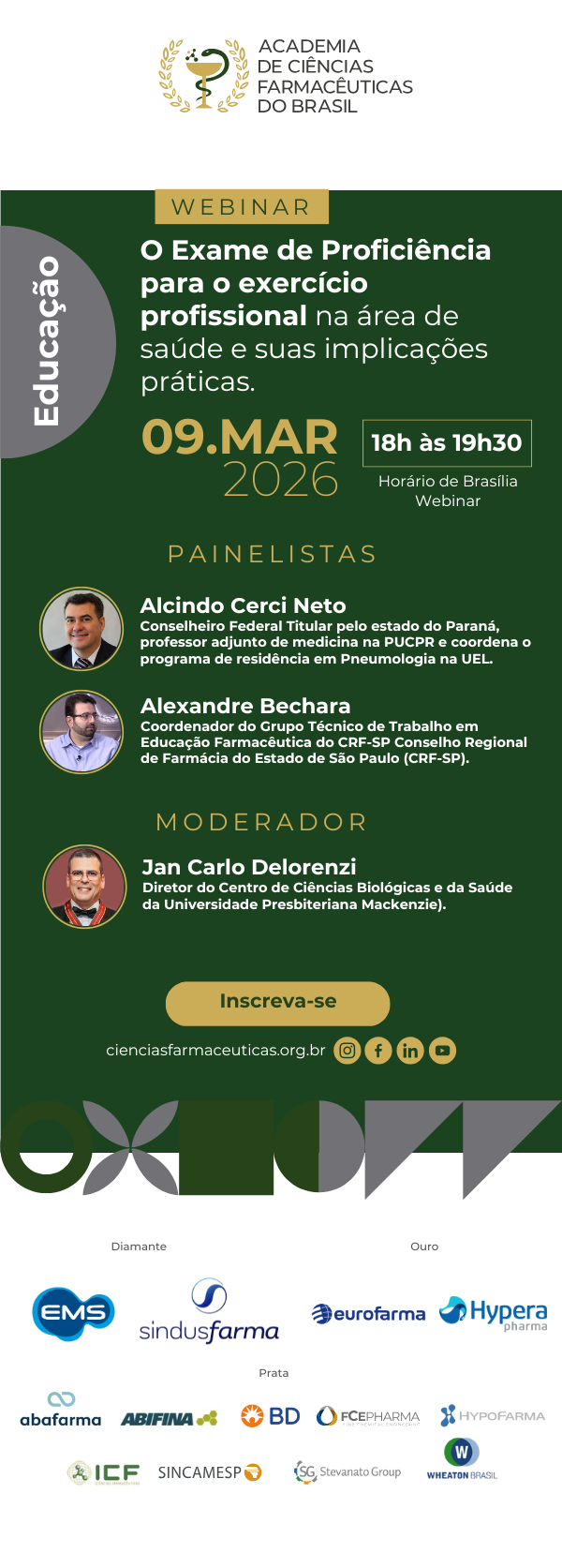 Moderação: Acad. Jan Carlo Morais Oliveira Bertassoni Delorenzi, Titular da Cadeira nº 48 da Academia de Ciências Farmacêuticas do Brasil. Diretor do Centro de Ciências Biológicas e da Saúde Universidade Presbiteriana Mackenzie